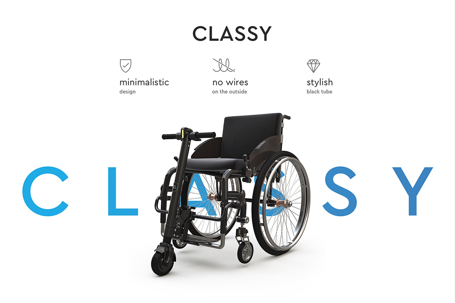 UNAwheel Mini is a category-defining product, which uniquely combines a sleek minimalistic design with advanced electric motor technology and lighweight patented structure. Precise maneuverability, soft suspension, airless tire and powerful motor make driving through city streets as comfortable as indoors. Simply fitting UNAwheel Mini to a manual wheelchair converts it into a power-assisted one, so it brings more enjoyment, mobility and independance.